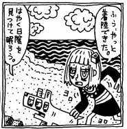 そしてカゴーは蘇った! 一度死んだにもかかわらず!! ここでは、哲先生の人気作品『この世の果てのアリス』に関係する資料や、これまで未発表だった『アリス』の原稿などを紹介するよ。 まずは、『この世の果てのアリス 改訂版』だ。これは、単行本として発表された『この世の果てのアリス』(『旧約』バージョンという)の途中からのお話になっている。『旧約』では、アリスとキートは島に着くとすぐに、木の実を食べ、おなかいっぱいになって眠る。ところが『改訂版』では、木の実は食べたものの、「ガプー ガプー!」という騒音のため、眠れない。原因は魔物の鳴き声だったという話になっている。今回アーカイブでは、改訂版、その一部を紹介するよ。 ←未発表だった『改訂版 この世の果てのアリス』の1コマ。『改訂版』は、アリスとキートが「世界の果てにもっとも近い島」に到着したところから始まる。単行本『アリス
