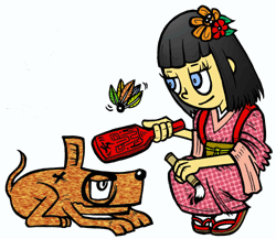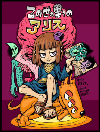 下』で言うと、31ページの続きということになる。また、『この世の果てのアリス』には『改訂版』とは別に『新約』というバージョンがある。これは、アリスと同じく神の使命を帯びたカゴーという少年が、アリスの生きる時代に突如復活するという話。アーカイブではその最初の部分を初公開。 いつになるかはわからないけれど、いずれこれらのマンガはきちんと描き直された上で単行本になるらしいから、楽しみだね。哲先生の宿題が早く終わるよう、みんなも応援しよう。 『改訂版』および『新約』は、右上のアイコンをクリックすると読めるよ! 次はアリスに関する資料を紹介するね。 ![]() ↑これは、お正月用のイラストとして、哲先生によって描かれたもの。珍しいアリスの晴れ着姿だよ。キートの方は、「大人の事情」で目が二つになってる。大人はいろいろ大変だね。 ![]() ↑え? アリスがビックリマンに?(↑をクリックしてみよう) ビックリマン大好き、哲先生に、嬉しいパロディ・イラストを提供してくれたのは作場季野(さくばときや)先生。作場先生のイラストは、アルマイーターというサイトで見ることができるよ。作場先生は近日出版する哲先生の新刊、『ウィズダムじごく』の表紙も担当している。めっちゃくちゃ絵がうまいんだ。 ![]() ↑お次は、漫画家、御船麻砥(みふねあさと)先生によるアリスのイラスト。ちょっぴりイジワルそうなアリスがかわいい。キートも完全尻にしかれちゃってるね。「すごく大好きです」のコメント、シネ神が後ろにいるのも嬉しい。御船先生のサイト、大和ロデオで、他のイラストも見ることができるよ。 ![]() ↑御船麻人先生のイラストに合わせて哲先生が描いたアトラス。さっきのイラストが表、これが裏。単行本アリス表紙のパロディ仕様になっっている。 |