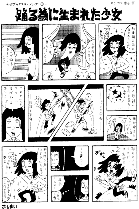 | 香山哲先生のコメント 完全に悪のりして描いた作品群です。コミックH、コミックキューやなんかに載ってたナンセンス雰囲気だけ漫画を、何も考えずに描いただけの漫画たちです。今でも「カスミマートであった人だろ」、「おしりやぶれたズボン」、など、突発的に描かねばならない時にはこういう雰囲気だけの漫画を描く事があります。どちらかというとこういうものは画集に近いものがあり、その絵すら成熟してなかったこの頃では、本当に意味がない漫画だなあとつくづく思います。8話は完全に一枚で独立したフリーペーパーですね。そういう気分で作ったと思います。 |
