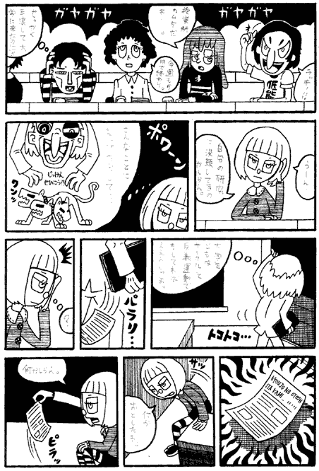 | 香山哲先生のコメント 手塚治虫「ネオファウスト」のパクり。主人公が1話1話変わっていくシステムを思い付いて、それをやろうと思っていたが、この頃はおそらく違う事を一生懸命していたと思う。漫画に対する情熱もそこまでなかったし、はっきりいえばこの頃はまだ漫画をなめきっていた時代だと思います。今でもそうなのですが、僕はどうも大学生という人種を描くのがどうしても下手なようで、うまくいってもフリーター、下手すれば幼稚園児のような挙動を大学生にとらせてしまいます。こういった事はやはり僕の人間観察が足りないからであり、そういう事を思うと、色々と考え込んでしまうような気分になります。 |
