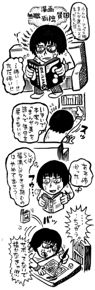 福満しげゆき「僕の小規模な失敗」青林工藝舎オビ文読みます。 「"このままじゃダメになる…すべてがダメになる大いなる予感!" 恋愛ゲームに参加できず、学歴コースからも脱落し、現状打破をねらった漫画コンクールでは相手にされない、そんなマンガ家志望の主人公の将来は一体どうなる? これぞアックス版まんが道。」 1ページに10コマ以上あるのがザラ、しかも1コマに3つも4つもフキダシ。それでひたすらモテない陰湿なまんが道を展開され、肝心の漫画はウケず、工場をクビになり、同級生たちは結婚したり「あ…涙でちゃった」の連続。唖然とするほどの凡人、ヤンキーを見ても、彼らの方が幸せであり確実にモテているという現実を必要以上に感じてしまう主人公がただひたすらカイジ並みに「うっ…」「つらい…」「怖い…」を大げさな話で無く1ページに1回は発する真の暗さは(決して)アックス系でない(ありえない)僕(香山哲)ですら感染される強烈さ。 はあ、みんなに紹介したらようやくふさいでた気分がましになってきました。あと、僕、ここまでひどくないしね!大丈夫!大丈夫!! (もしかしてカフェとか普段から行く人たちはハロウィンパーティとかするのかな…今日日曜だしな…出掛けてもすること無くて帰っちゃうんだよな…よく解るよ…こんなの書いてないで漫画描こう…) http://www.amazon.co.jp/exec/obidos/ASIN/4883791955/250-3814458-7762660 (2005.10.23/香山哲) |